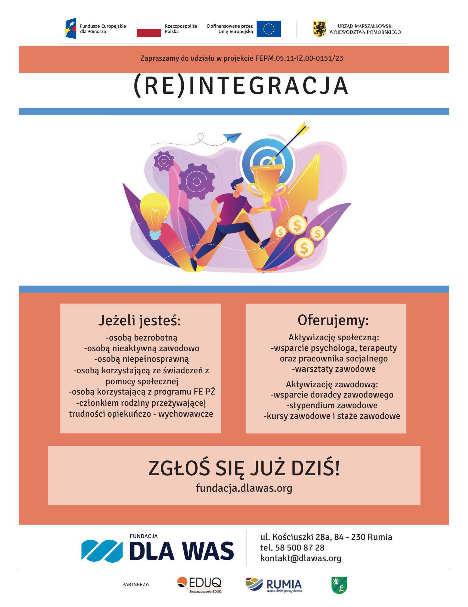 Projekt „(Re)Integracja” nr FEPM.05.11-IZ.00-0151/23 realizowany jest przez Fundację Dla Was w ramach Działania 5.11 Programu Fundusze Europejskie dla Pomorza 2021–2027. Projekt współfinansowany jest przez Unię Europejską (EFS+) oraz budżet państwa.